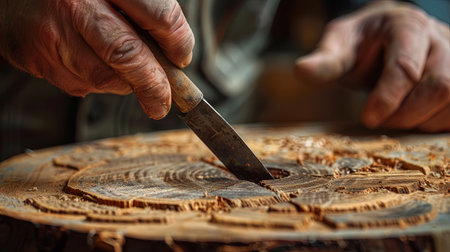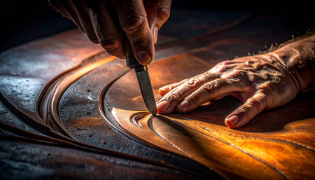 In the quiet focus of a dimly lit workshop, an artisan's experienced hands guide a sharp tool with meticulous precision.