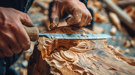 In the quiet focus of a workshop, the weathered hands of a master artisan guide a sharp chisel across a block of wood.