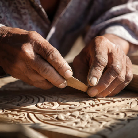 Craftsman's hands meticulously sculpt detailed patterns into wooden blocks, showcasing the intricate craft of wood carving. The image highlights the textures of the wood, the tools used, and the focused concentration of the artisan at work. The dark background emphasizes the artistry of the wood carvings.