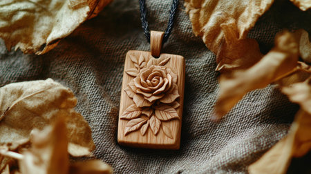 This stunning hand-carved wooden pendant showcases a detailed rose design, perfectly blending artistry with nature. Surrounded by autumn leaves, it offers a warm and rustic charm.