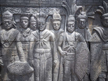 Indonesia, Java: Frescoes in bas relief in blue; carved and painting images related with indonesian legends and beliefs