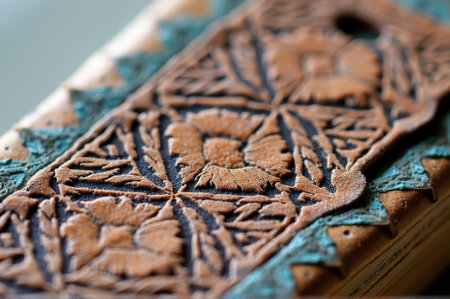 Detailed designs and patterns created from engraving techniques are shown on a dark surface, reflecting a rich historical mood.