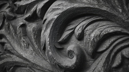 A stunning close-up image showcases an intricately hand-carved wooden design featuring elegant swirls and flourishes. This black and white photo emphasizes the craftsmanship and artistry involved in creating such detailed textures and patterns. Perfect for design inspiration.