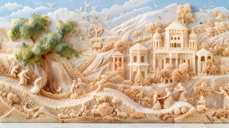 This exquisite artwork showcases an intricately carved relief featuring mountains, trees, and historical architecture, embodying craftsmanship and nature's beauty.