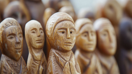 A collection of intricately carved wooden figures is displayed at a market, highlighting the skill of artisans and the cultural significance of handcrafted art.