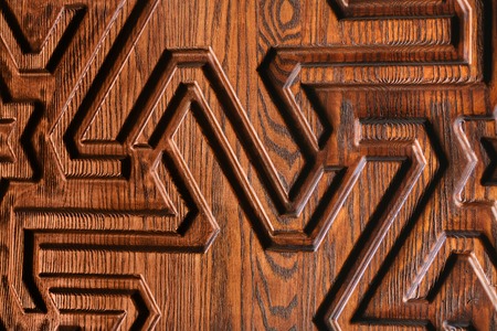 Wooden texture, beautiful decorative geometric pattern carved on a tree