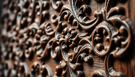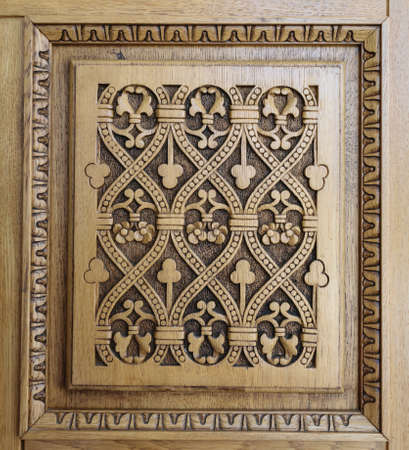 Closeup detail of hand carved pattern from an ancient massive wood door