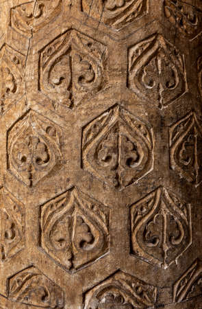 Khiva, Uzbekistan - June 5, 2019: Wooden pilar with decoration in the Juma mosque in the centre of the old town of Khiva in Uzbekistan.