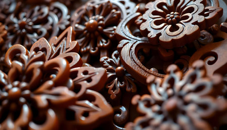 Beautiful wooden carving with flowers and birds photographed in close-up