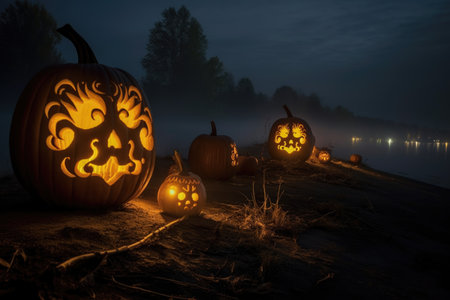 glowing carved pumpkins on a dark, foggy night, created with generative ai