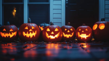 A row of carved pumpkins glowing with eerie faces, perfect for Halloween decoration. Their warm light creates a festive and spooky atmosphere for autumn celebrations.