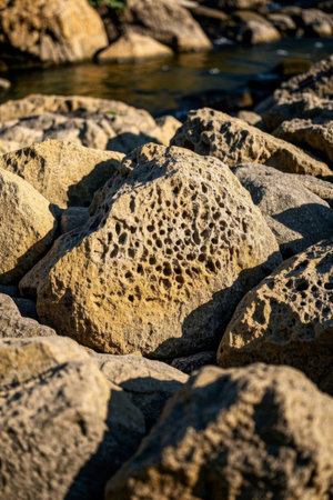 Close up of porous rocks by the river