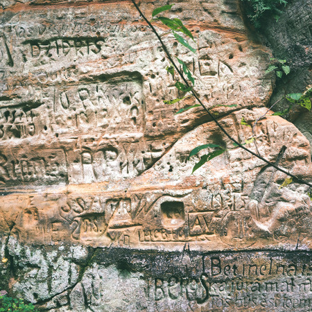 sandstone cliffs with inscriptions near tourist trails - instant vintage square photo
