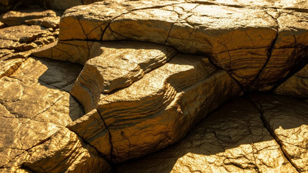 A detailed close-up view of weathered rock formations that appear to be golden in color. The surface is highly textured, showcasing intricate cracks, layers, and organic patterns formed by natural erosion over time. Sunlight casts strong shadows and highlights, emphasizing the ruggedness and the metallic sheen of the rock. The warm, earthy tones of gold, yellow, and brown dominate the creating a visually rich and abstract natural pattern. highlights the intricate beauty and geological...