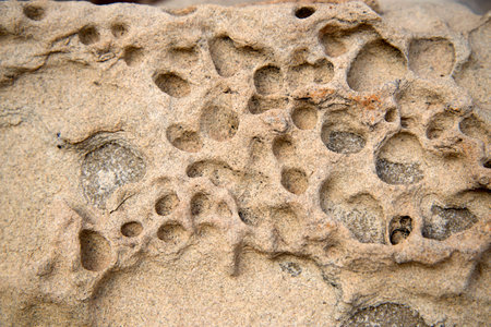 Close-up of intricate honeycomb weathering patterns on sandstone rocks. Showcases natural textures and erosion features. Ideal for geological studies and nature backgrounds.