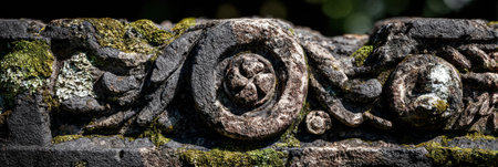 Stone carvings featuring complex designs are partially covered with moss, showingcasing artistry from a distant era in a vibrant natural setting.