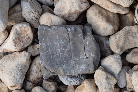 Stones with engraved symbols lay on a dark surface, showing details of erosion and time while highlighting their natural patterns and shapes.