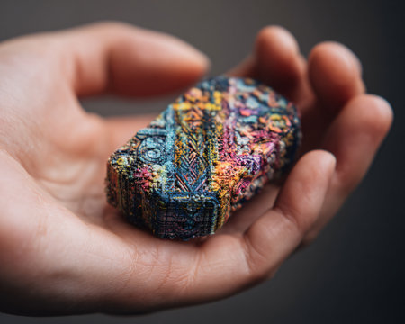 Hand holding a heart-shaped object with a colorful pattern on a dark background