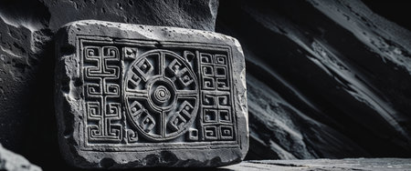 AI Generated. Ancient artifact displays carved symbols on a dark textured surface