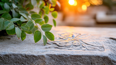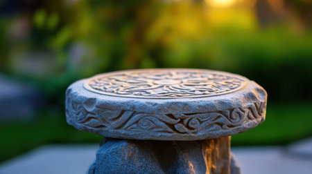Ornate garden stone with intricate designs, warm light casting soft shadows