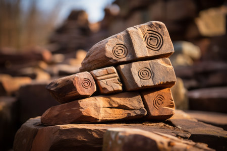 Carved abstract markings appear on ancient stone symbols in a close-up view, highlighting the intricate details and textures of the artwork.