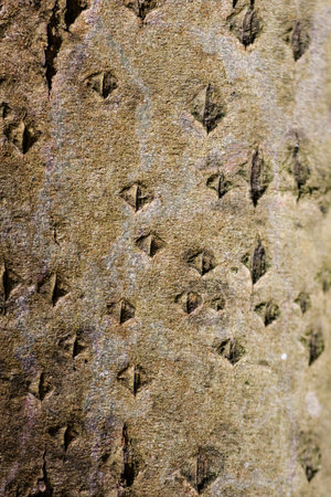 Chiseled stone fountain texture showcasing intricate leaf patterns and craftsmanship in a serene outdoor setting