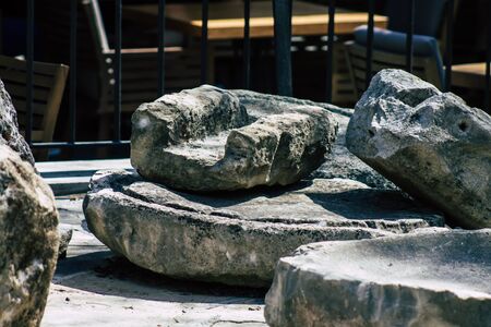 Marble part of the construction of an ancient building with elements of stone carving. Ancient stone carvings. Ruins of an ancient Greek city