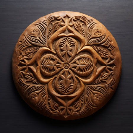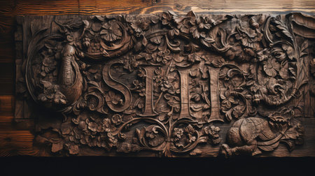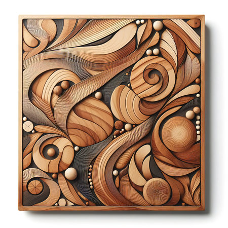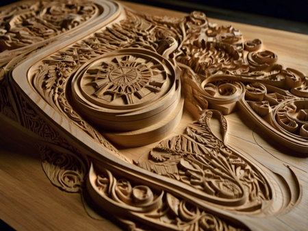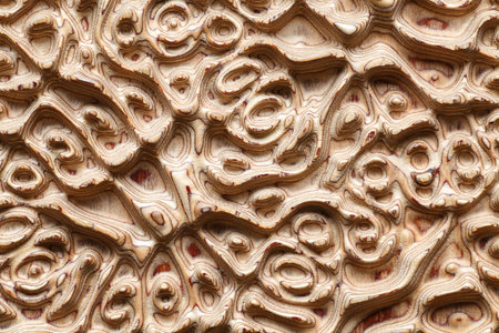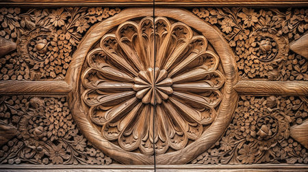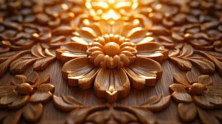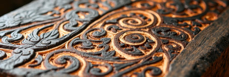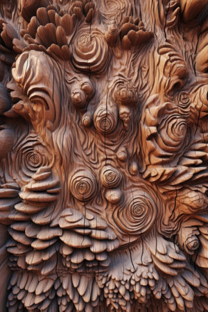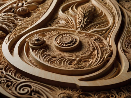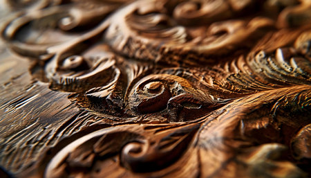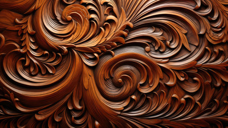 Intricate wooden carving with ornate patterns and swirls in warm tones. That the image is generated using AI.