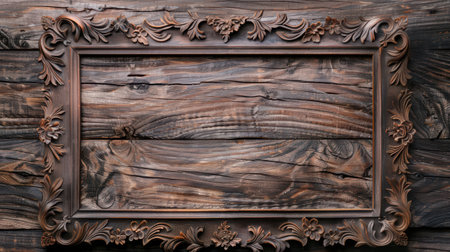 Detailed wooden picture frame with intricate carvings on a rustic wooden background, perfect for vintage or antique-themed designs.
