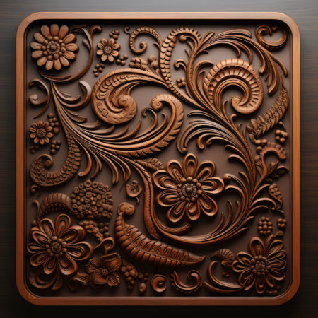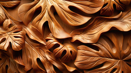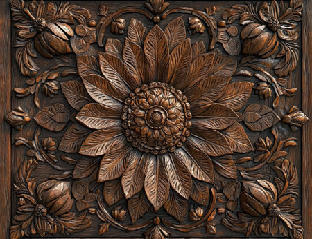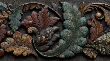 a vector wooden background design featuring intricate floral and leaf decorations, rendered in cinema4d with sculptural reliefs. the dark bronze color adds depth to the artwork created by dmitry vishnevsky. the tactile canvases and meticulous design result in texture-rich visuals that captivate the viewer. ai generated