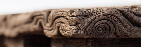 This image showcases a detailed view of aged wood. The natural material reveals intricate swirling patterns and textures. The warm brown tones suggest a rustic or vintage aesthetic. This could be useful for projects related to design, backgrounds, or artistic concepts. The scene appears indoors, possibly a table.