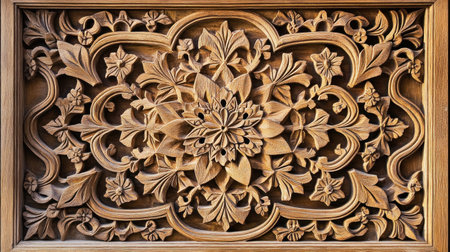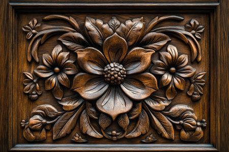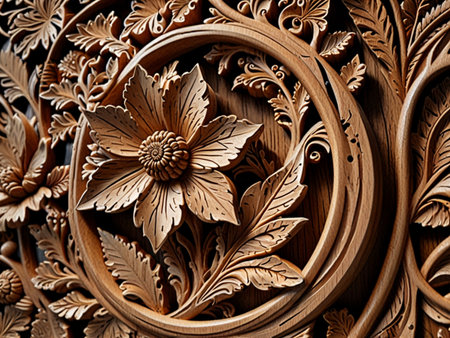Detailed floral pattern carved into wood panel, creating an ornate and decorative piece