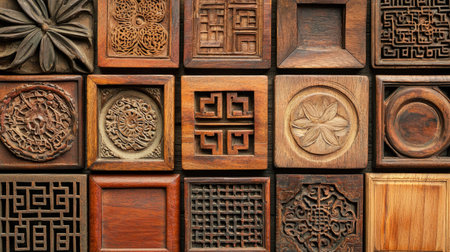 A stunning collection of wooden blocks showcasing intricate carvings and rich textures. Each piece features unique designs that reflect traditional craftsmanship and artistry.