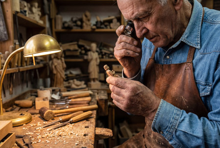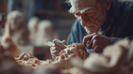 An elderly artisan focuses on carving delicate details into a wooden sculpture in a cluttered workshop, surrounded by completed works and tools.