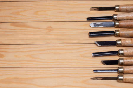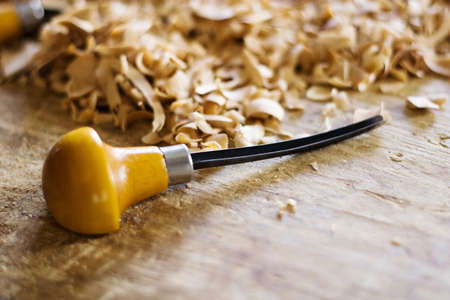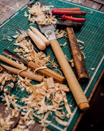 Carving. Handmade by the master. Tools for carving. Woodwork. Chip.