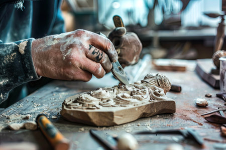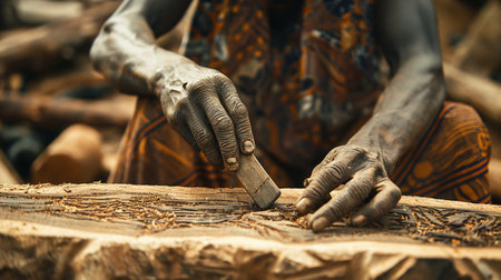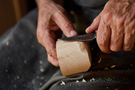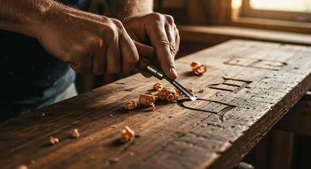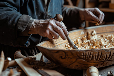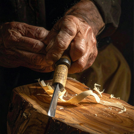 In the quiet focus of a workshop, the weathered hands of a master artisan guide a sharp chisel across a block of wood.