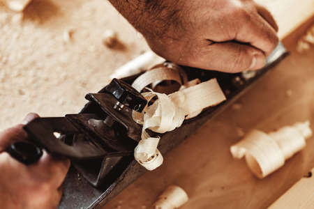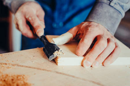 The carpenter uses a chisel to handle the edges of the product. Toned image. close up view