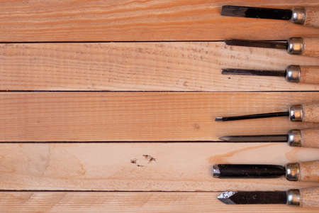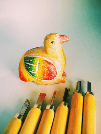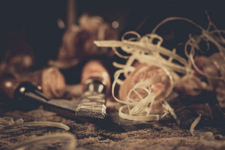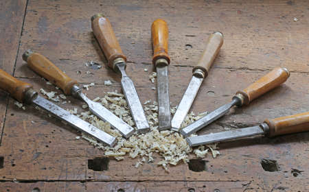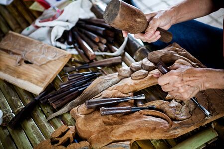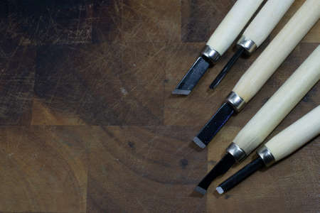 Wood carving tools arranged in an unorderly manner, carving wood in Thailand
