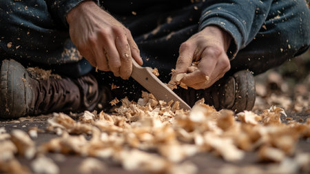 A skilled artisan carves wood with a knife, creating delicate shavings in a serene outdoor environment. The image captures the beauty of craftsmanship.