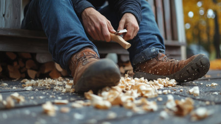 A skilled craftsman carves wood outdoors, surrounded by shavings and nature. A cozy scene showcasing creativity and focus during a tranquil moment.