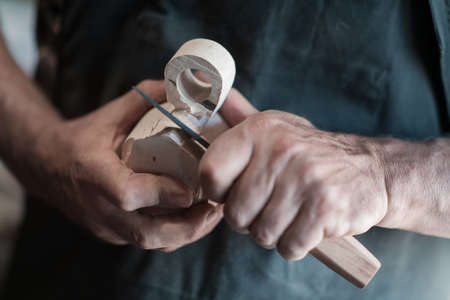 Master artisan luthier working on the creation of a violin. painstaking detailed work on wood.