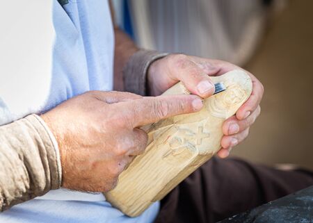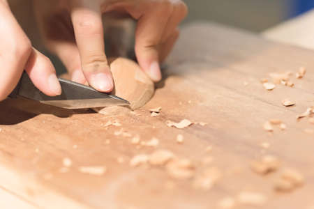 Close-up of craftsman carving wood with knife, woodworking and craftsmanship concept, skilled hands shaping wooden block, hobby and creative occupation, handmade art, detailed work.