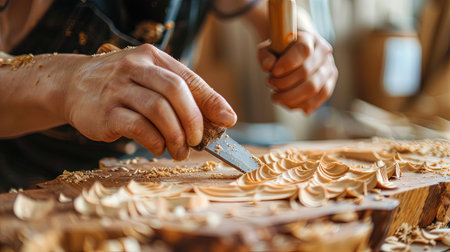 Close-up of a woodcarver's hands meticulously shaping a piece of wood with a chisel, showcasing the artistry and detail involved in creating intricate designs.