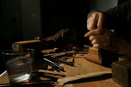 The carpenter uses a chisel for carving. Carving view. Toned image.