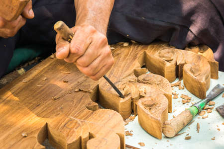 Craftsmans hands working on wood carving, with gouge and chisel Cabinetmaker, carpentry