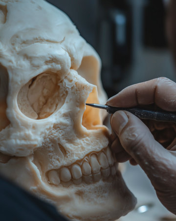 An artisan skillfully carves a wooden skull, showcasing intricate details and craftsmanship. The workshop atmosphere highlights the creativity involved in wood carving.