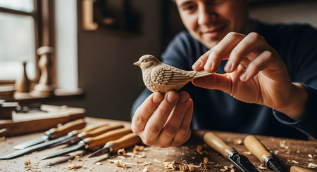 A smiling craftsman proudly holds and inspects a small, intricately carved wooden bird in his workshop. His workbench is filled with wood shavings and various carving tools, illustrating the joy and satisfaction of traditional woodworking and hobbies.