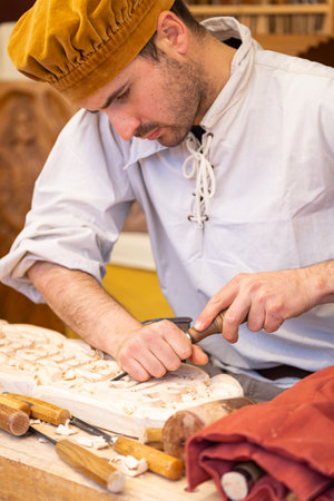 Man sculpting with chisel in wood plank making sculpture in workshop.