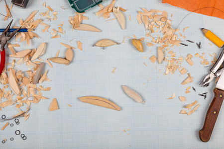 Handmade wooden fishing tacles graph paper background with tools and blanks. Mockap for advertisment and publishing.