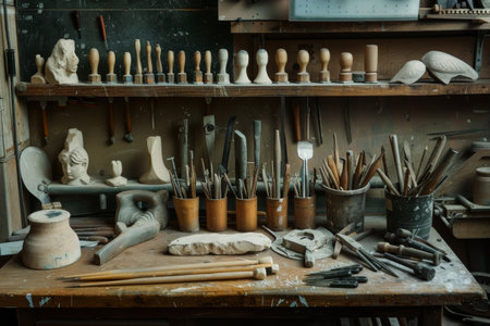 a workbench covered in tools and carving materials, with a sculpture in progress visible nearby, created with generative ai